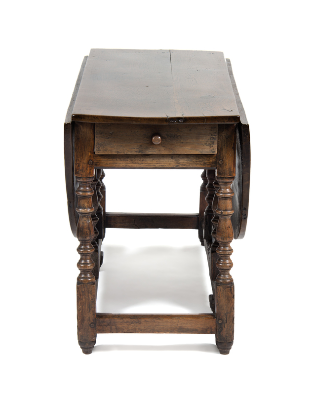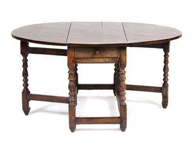 having a rectangular top with rounded ends and two D-shaped leaves, raised on turned legs joined by stretchers.This table was always a main focal point of the living room and displayed many family photots and flowers from the garden.