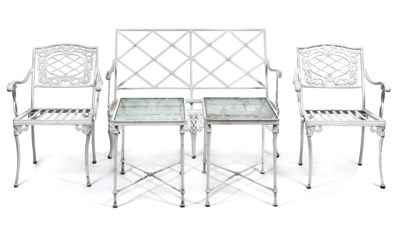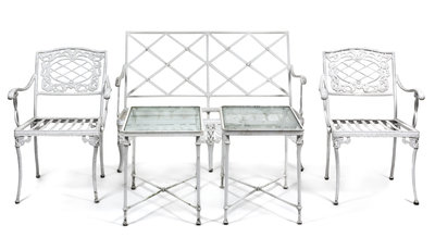 comprising a settee, a pair of side tables with glass tops and a pair of armchairs.