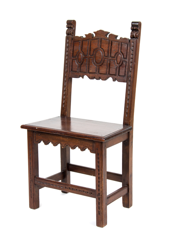 having a carved back within straight stiles over a plank seat, raised on square legs joined by stretchers. This lot was supplied to the home by Addison Mizner for the original owner, Rodman Wanamaker, and remained in the home during the duration of the Kennedy years.