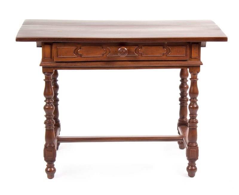 having a rectangular top over a frieze drawer, raised on turned legs joined by stretchers.This lot was supplied to the home by Addison Mizner for the original owner, Rodman Wanamaker, and remained in the home during the duration of the Kennedy years.
