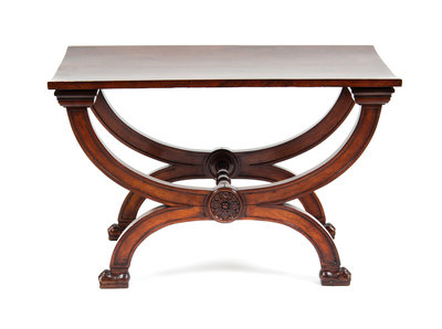 the rectangular top raised on curule supports joined by a turned stretcher and ending in paw feet.