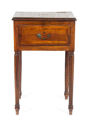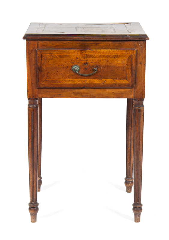 having a rectangular banded top and a deep frieze drawer, raised on fluted tapering legs. This lot was supplied to the home by Addison Mizner for the original owner, Rodman Wanamaker, and remained in the home during the duration of the Kennedy years.