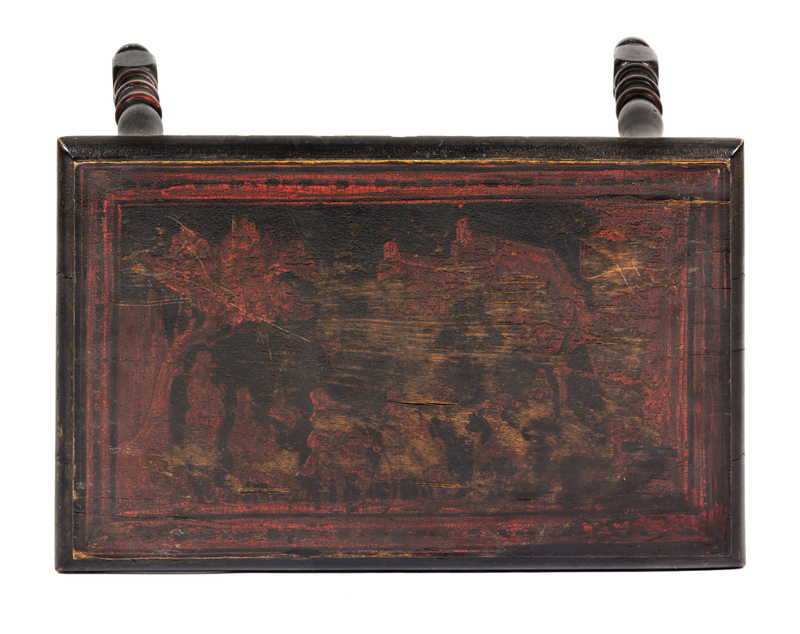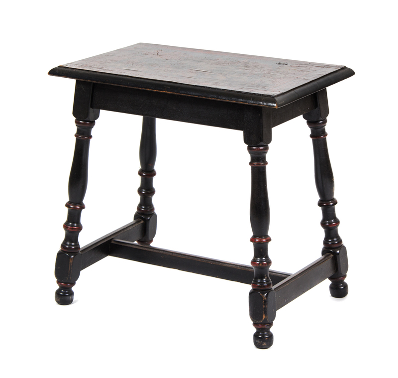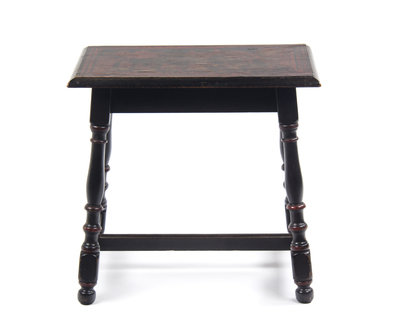 the rectangular top retaining remnants of a painted figural scene, raised on turned legs joined by an H-form stretcher.