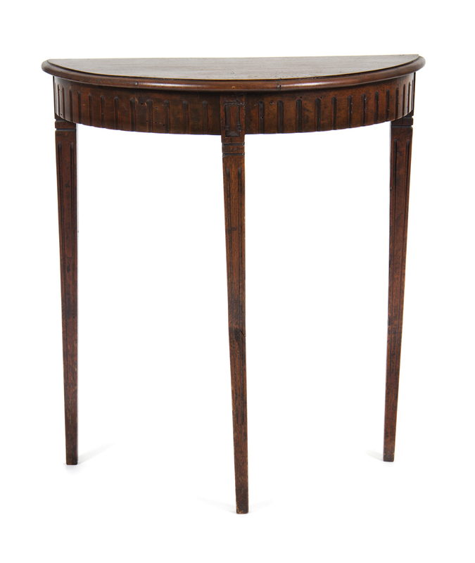 having a demilune top over a fluted frieze, raised on square tapering fluted legs.