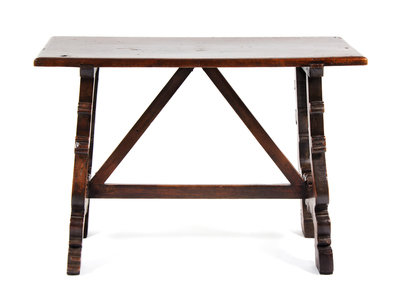 having a rectangular top raised on twin open supports joined by stretchers. Placed in the home by Addison Mizner for the original owner, Mr. Wanamaker and remained in the home during the duration of the Kennedy years.