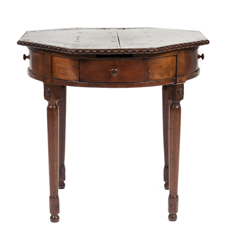 having an octagonal top with a beaded border and opposing frieze drawers, raised on turned tapering legs.