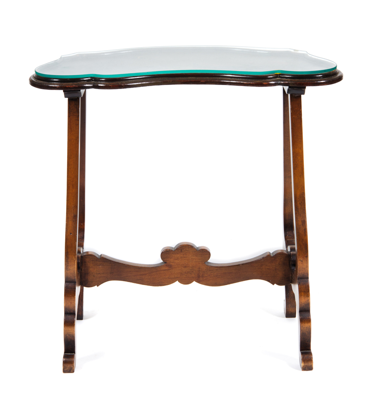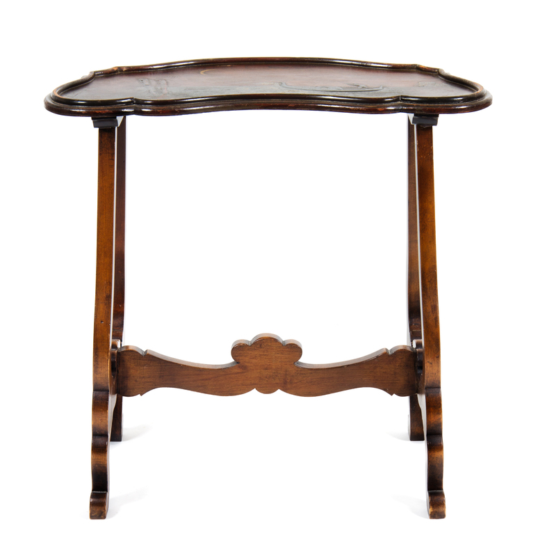having a reniform top decorated with a Venetian gondolier scene and raised on trestle supports joined by a stretcher. This lot was supplied to the home by Addison Mizner for the original owner, Rodman Wanamaker, and remained in the home during the duration of the Kennedy years.
