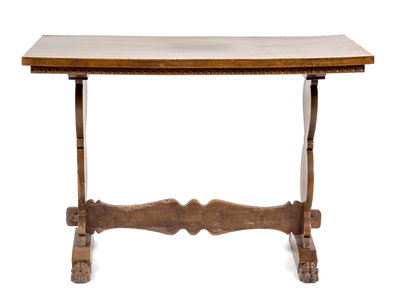having a rectangular top with a carved lower border raised on twin supports joined by a shaped stretcher. This lot was supplied to the home by Addison Mizner for the original owner, Rodman Wanamaker, and remained in the home during the duration of the Kennedy years.