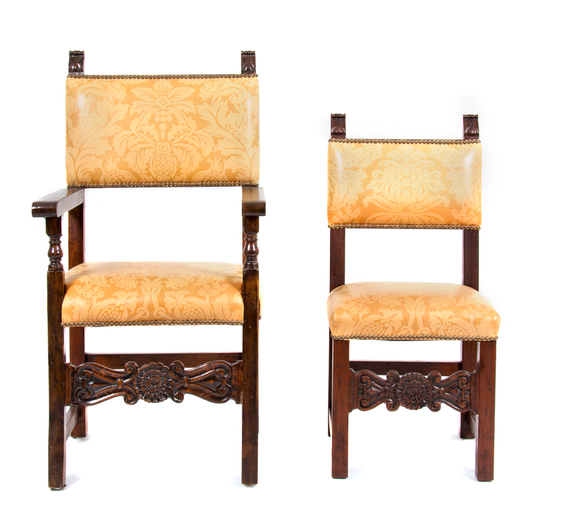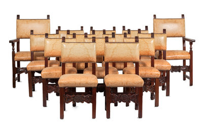 A Set of Fourteen Spanish Baroque Style Walnut Dining Chairs
