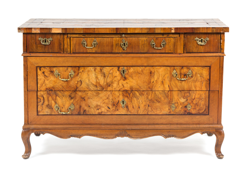 with a rectangular top and three short drawers above two long drawers, raised on short cabriole legs.
