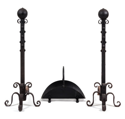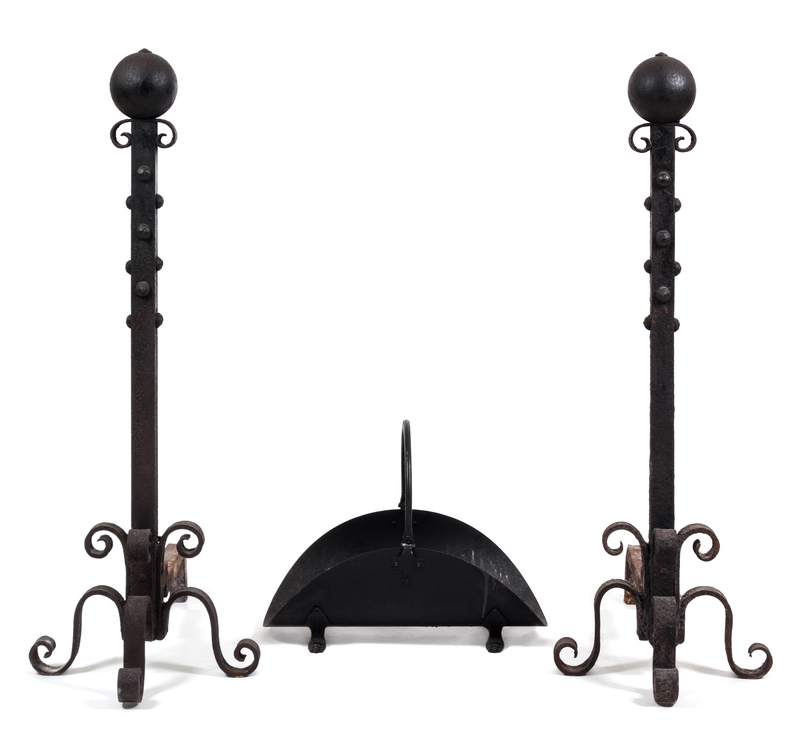 raised on scrolled feet, together with a log basket and a scrolled strapwork tool stand.This lot was supplied to the home by Addison Mizner for the original owner, Rodman Wanamaker, and remained in the home during the duration of the Kennedy years.