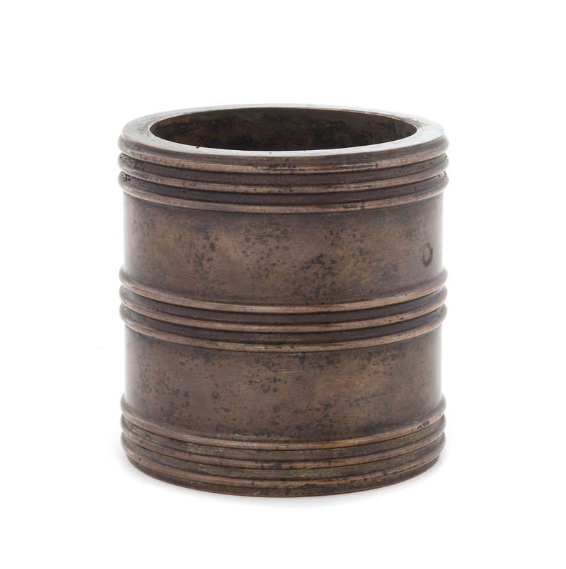 of cylindrical form, the body cast with three parts of tri-ring decoration, the base impressed with a six-character Xuande mark within a rectangular panel.