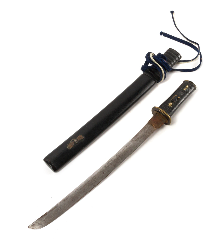 the Koshirae with dragonfly decoration, having a copper oval tsuba, fuchi with inlaid gilt chrysanthemum sprays.