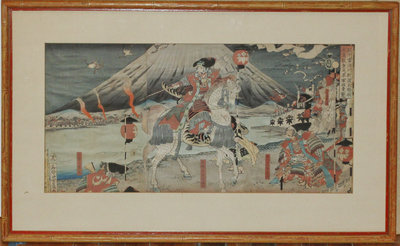 depicting a warrior on horseback, matted and framed.