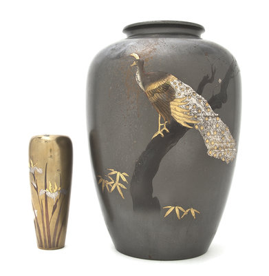 both of tapering baluster form, one decorated with a peacock and gilt maple leaves, the other with irises on a gilt ground.