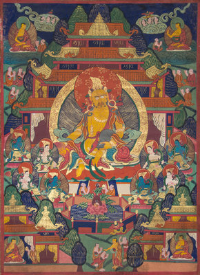 depicting a central deity seated below a tiered structure and holding a peach and an ox, with a gilt accented aureole, flanked by smaller figures of deities and disciples, the reverse having Sanskrit inscription and handprint in red paint.