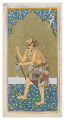 depicting a man wearing a multicolor dhoti, bearing a mug and a cane, against a background with foliate scrolls, framed.