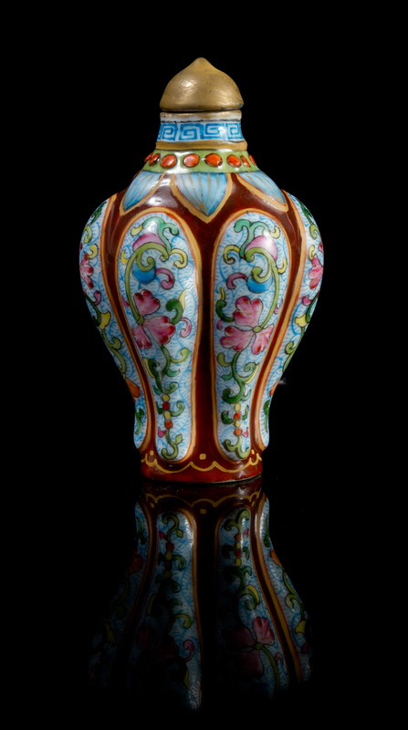 of lobed baluster form, each lobe painted to show floral scrolls, the neck decorated with a band of lotus leaves below a key-fret border and a circle of raised bosses, bearing a four-character Qianlong iron red mark to the underside.