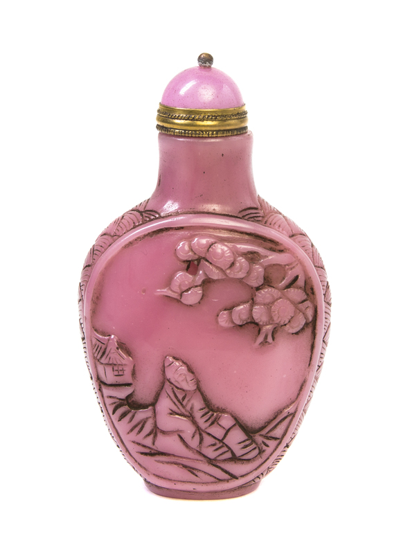 of opaque rose color and of compressed flask form, depicting a man resting under a flowering tree and a man bearing a shoulder pole to the reverse, the sides incised with layers of waves, having a glass stopper.