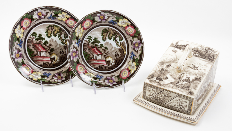 each with polychrome decoration depicting a figure and a cowin a landscape, together with an English transfer decorated cheese dish.