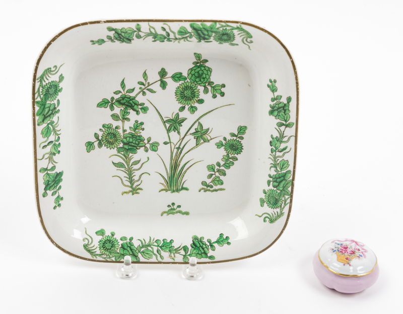 the lid decorated with a basket of flowers, together with a Spode plate.