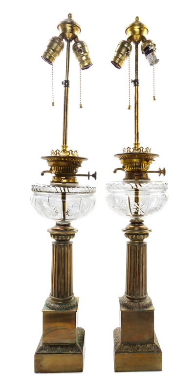 each with cut glass font and columnar standard, electrified.