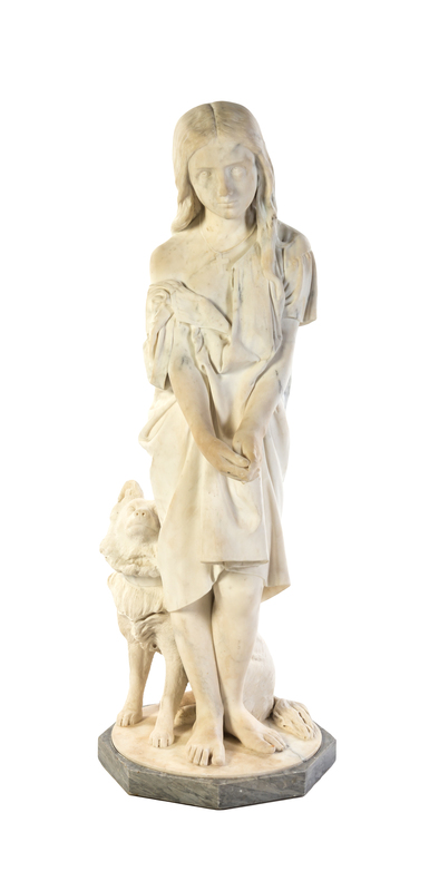 depicting a young girl and a seated dog raised on a circular base, incised A. Taglioni, Roma 1881, set on an octagonal base.