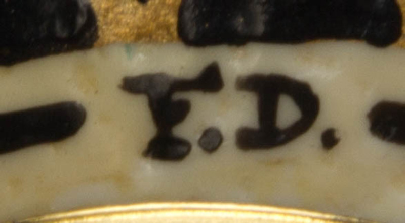 with stylized feather decoration, surmounted with a gilt metal anthemion finial, raised on a baluster form standard over a circular foot, signed F.D.