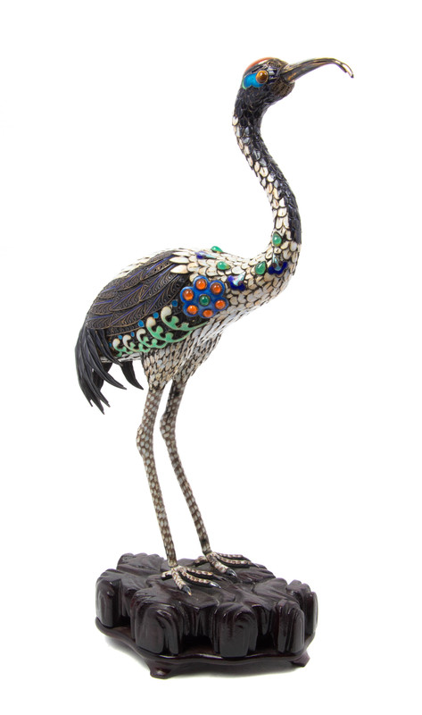 depicting a stork on a carved wood base.