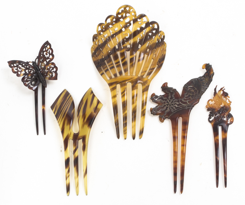 comprising a double prong hairpin with butterfly form handle, a double prong hairpin with dragon form handle, a double prong hairpin with silver overlaid handle, and two combs with shaped handles.
