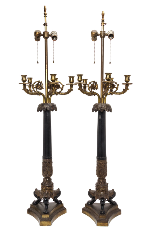 with reeded columnar standards raised on three legs each with paw feet over tripartite bases, mounted as lamps.