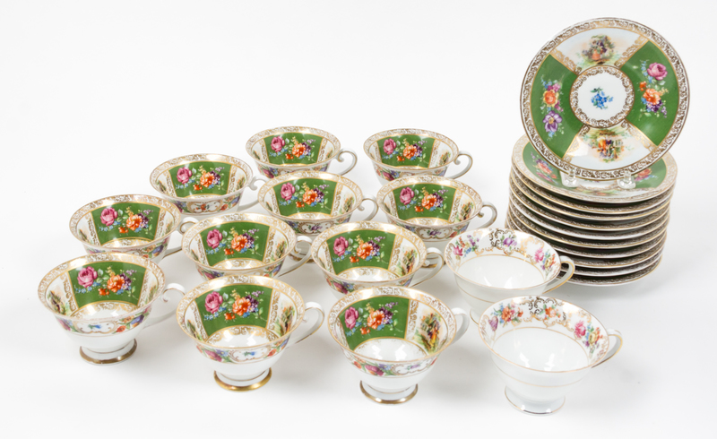 comprising 11 cups and 11 saucers, each with alternating floral panels, together with two associated tea cups (twenty-four pieces total).