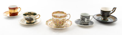 comprising a German handpainted teacup and saucer, a Greek teacup and saucer depicting the Acropolis, a Bavarian teacup and saucer, a handpainted Greek teacup and saucer and a Royal Albert teacup and saucer, each marked to the underside.