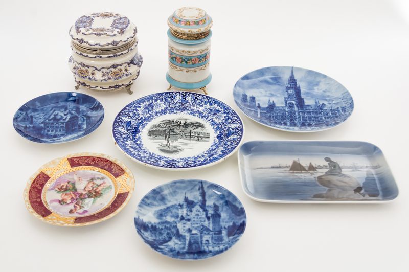 comprising a Royal Copenhagen tray depicting The Little Mermaid bronze sculpture at the Langelinie promenade in Copenhagen, three Alboth & Kaiser plates depicting village scenes, a Schramberg plate depicting a village scene, a Royal Vienna style plate depicting a figural scene with a gilt decorated claret border, and two dresser boxes transfer printed with floral and foliate decoration.