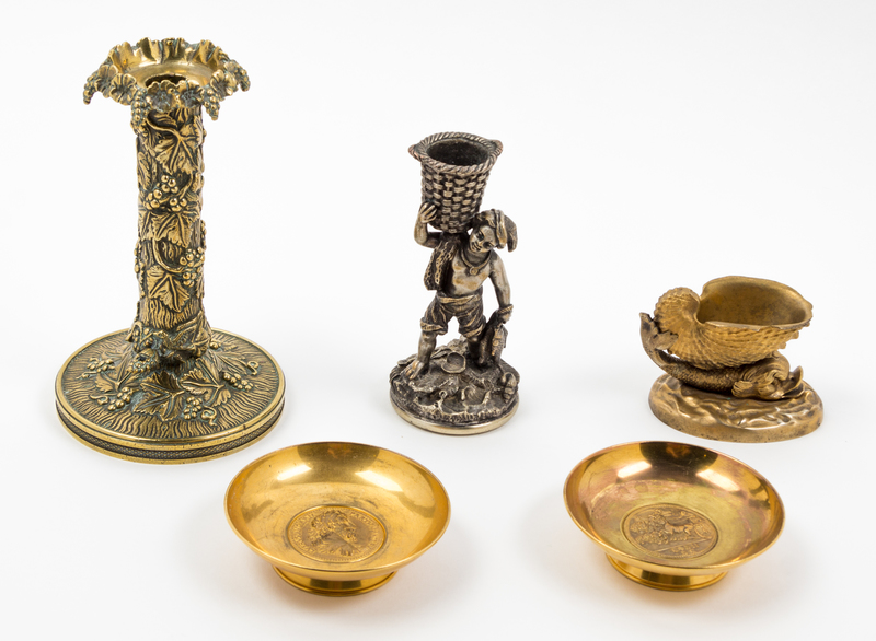 with five items, comprising two Christian Dior brass footed dishes, a match strike in the form of a fish supporting a nautilus shell, and two candlesticks.