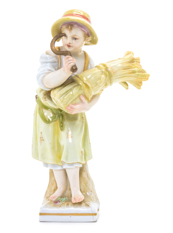 depicting a young girl with a sickle and a sheaf of wheat, with iron red KPM orb and underglaze blue scepter marks on the underside.