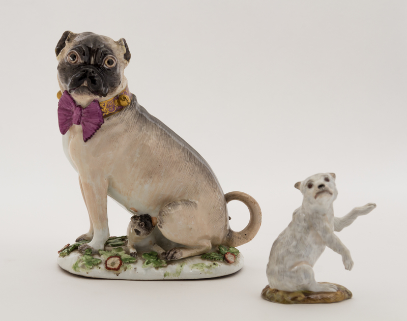 depicting a seated pug together with a small porcelain dog figurine.