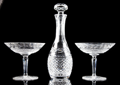 comprising a decanter and a pair of compotes.