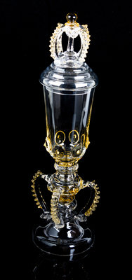 of lidded form, raised on a turned stem ending in a circular foot.