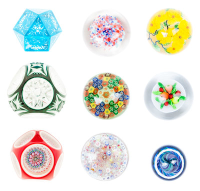 of various form, make and vintage, including three with millefiori decoration, one with fruit, and seven others.
