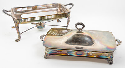 comprising a toast rack, two covered dishes, a warmer on stand and one stand