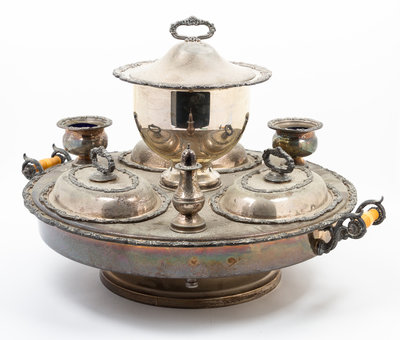 having a covered center bowl surrounded with covered entrees, castors and cobalt glass lined salts