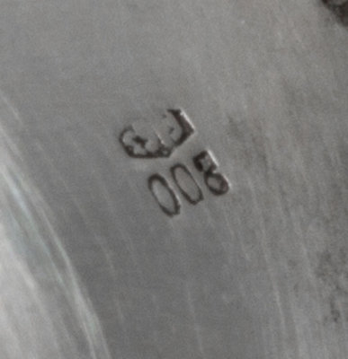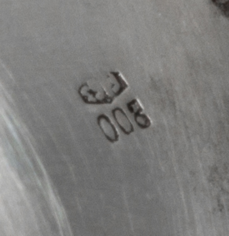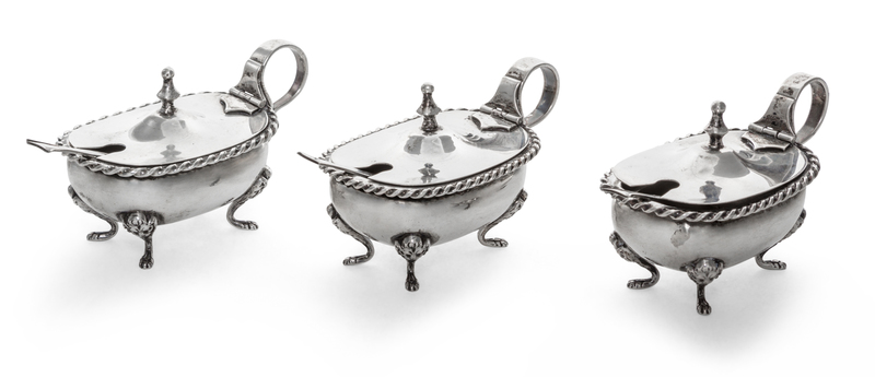 oval with twisted rims and raised on four paw supports, scroll handles, with three matching salt spoons and removable glass liners