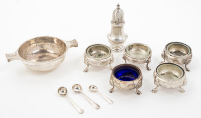 together with four English open salts with three spoons, Walter Wilson, an English caster, Walter Wilson and an English open salt, Crichton
