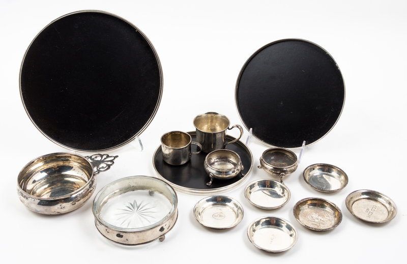 comprising three Gorham ebonized trays with silver rims, two child's cups, a Lunt porringer, six ash receivers, two Gorham open salts and a Gorham silver and glass wine coaster