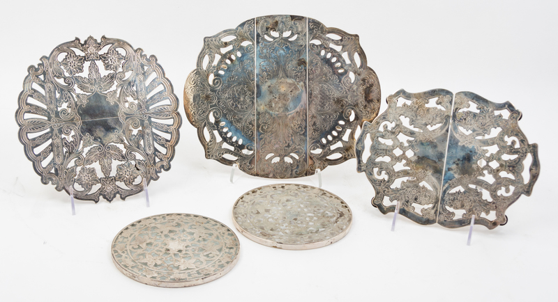 each of extendable form with foliate decoration; together with two American silver mounted trivets, one lacking glass