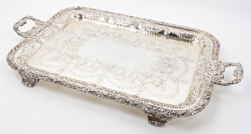 of rectangular form having pierced borders, raised on scrolling feet.
