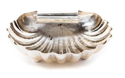 of shell form with scalloped edges and a scrolling handle, raised on pad feet