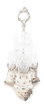 comprising three handled decanters and having pierced grapevine decoration throughout