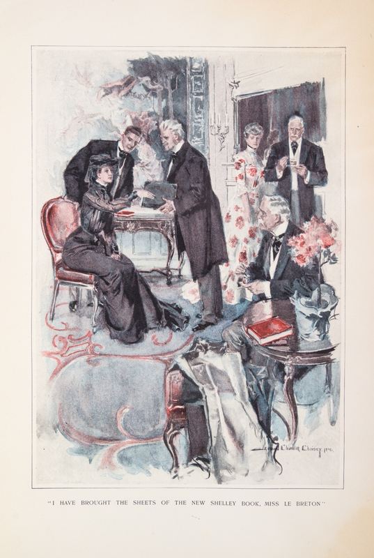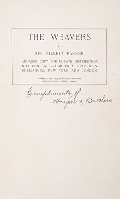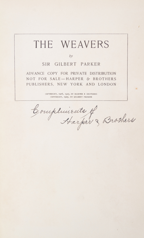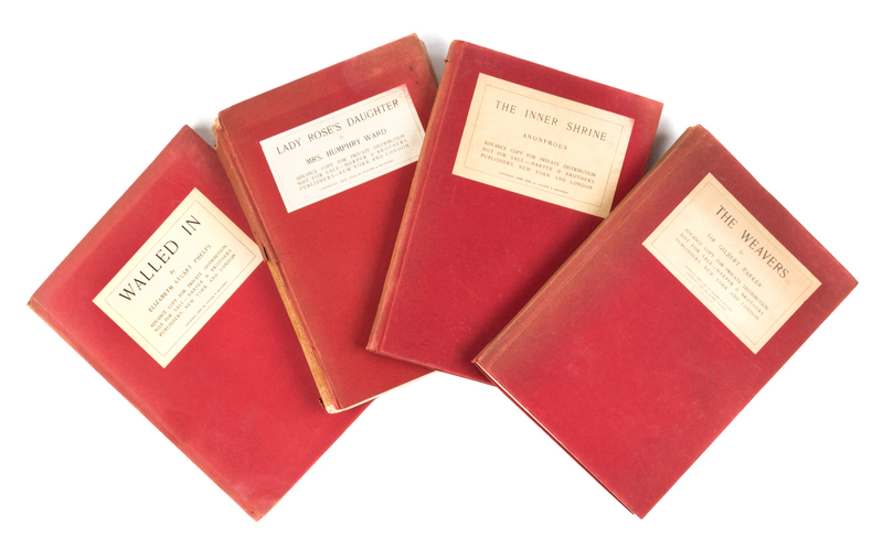 Four advance copies, each signed "compliments of Harper & Brothers," including Gilbert Parker, The Weavers, (1907), Mrs. Humphrey Ward, Lady Rose's Daughter, (1903), Anonymous, The Shrine, (1909), and Elizabeth Stuart Phelps, Walled in, (1907).4 vols. 8vo, red paper, printed paper spine labels. Boards worn and faded, spine deteriorated on one.